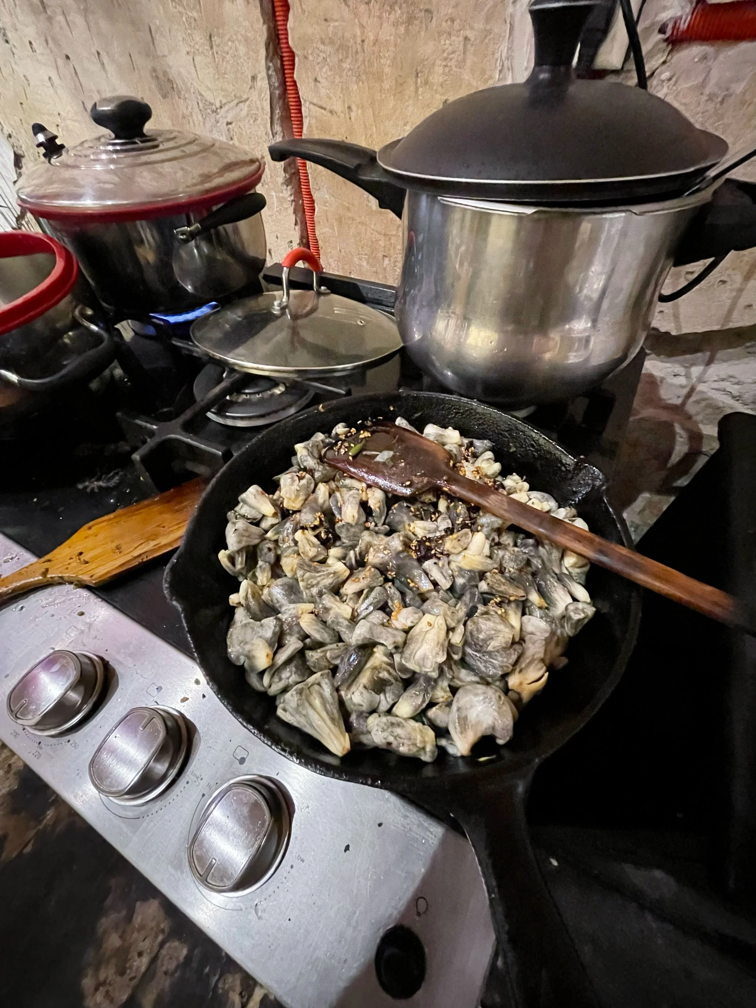 Rundown of the pics! Pics 1 & 2: Hammond Family Powers, Activate! at the El Tigre compound Pic 3: Hammond Family and Chava talking with Connie, out on the El Tigre patio Pic 4: Sometimes the only fat in the gravy is the fat-headed cook Pic 5: Before the fun, El Tigre patio in-the-raw Pic 6: Huitalacoche for the. stuffing and gravy Pics 7 & 8: Pinche BBQ saves us in a pinch! Pic 9: Morels, for dueling-fungi stuffing Pic 10: When you know where to go in CDMX Pic 10: Esther and crew prep some fine turkeys in CDMX Pic 11: Stuffing and roasted vegetables in the El Tigre oven — pics 1 - 5 courtesy of David Hammond